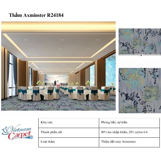 Ngoài ra, Thảm Axminster R24184 còn là lựa chọn hoàn hảo cho các phòng VIP, phòng họp cao cấp hoặc trung tâm sự kiện, nơi đề cao sự yên tĩnh và tinh tế.