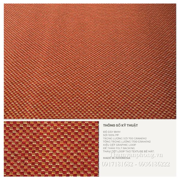 Bề mặt thảm được dệt chặt, sợi thảm liên kết chắc chắn giúp hạn chế lún xẹp trong quá trình sử dụng lâu dài. Nhờ cấu trúc cuộn linh hoạt, sản phẩm dễ dàng thi công trên diện tích lớn, đảm bảo tính liền mạch và thẩm mỹ cao.